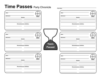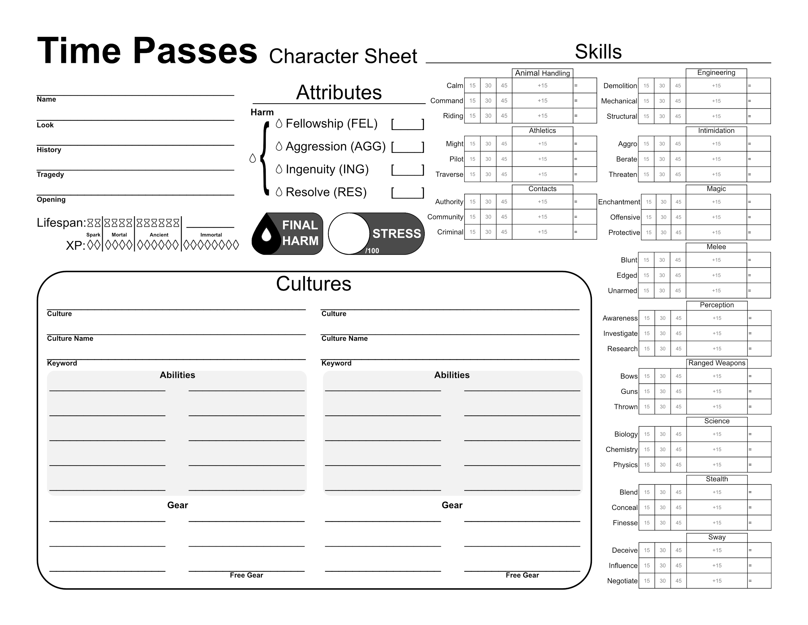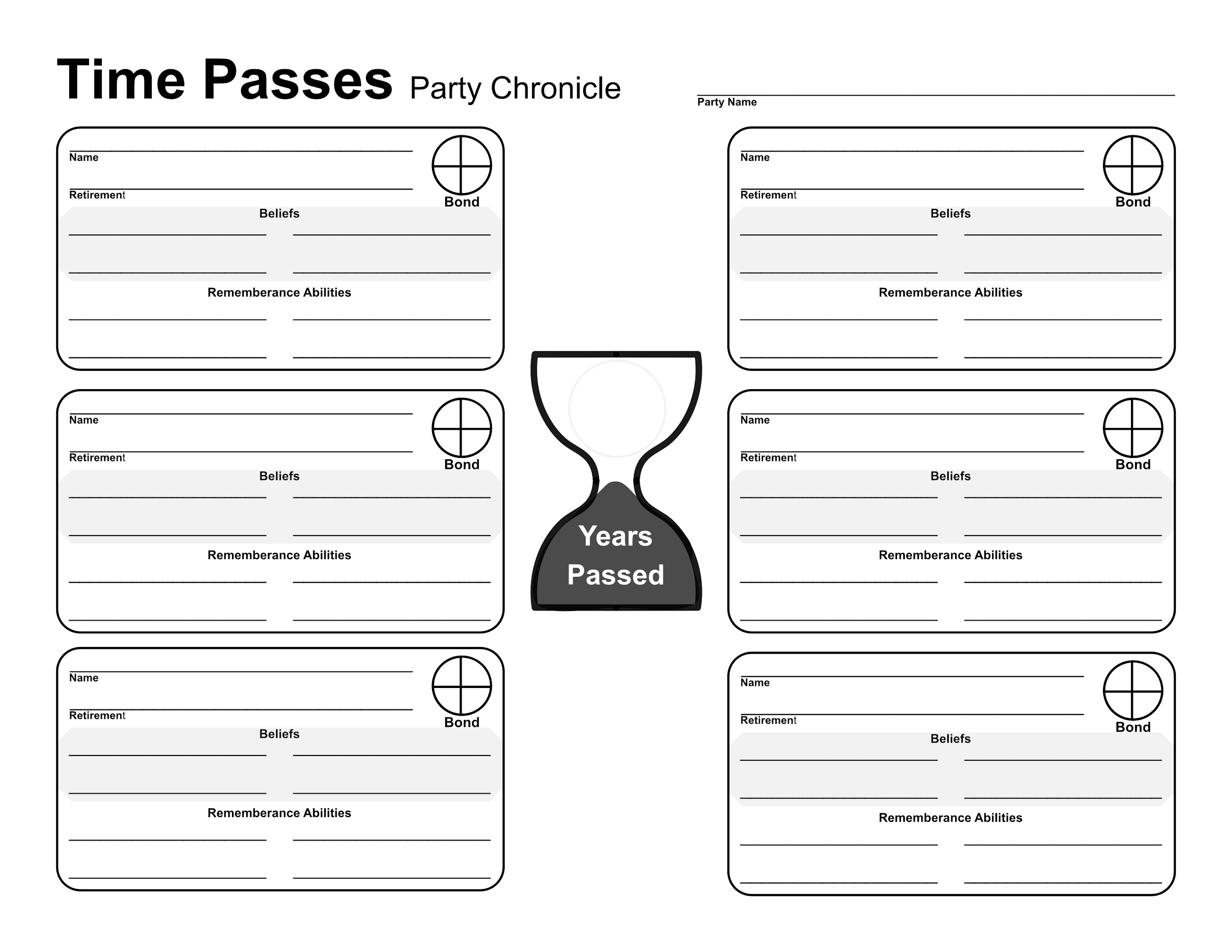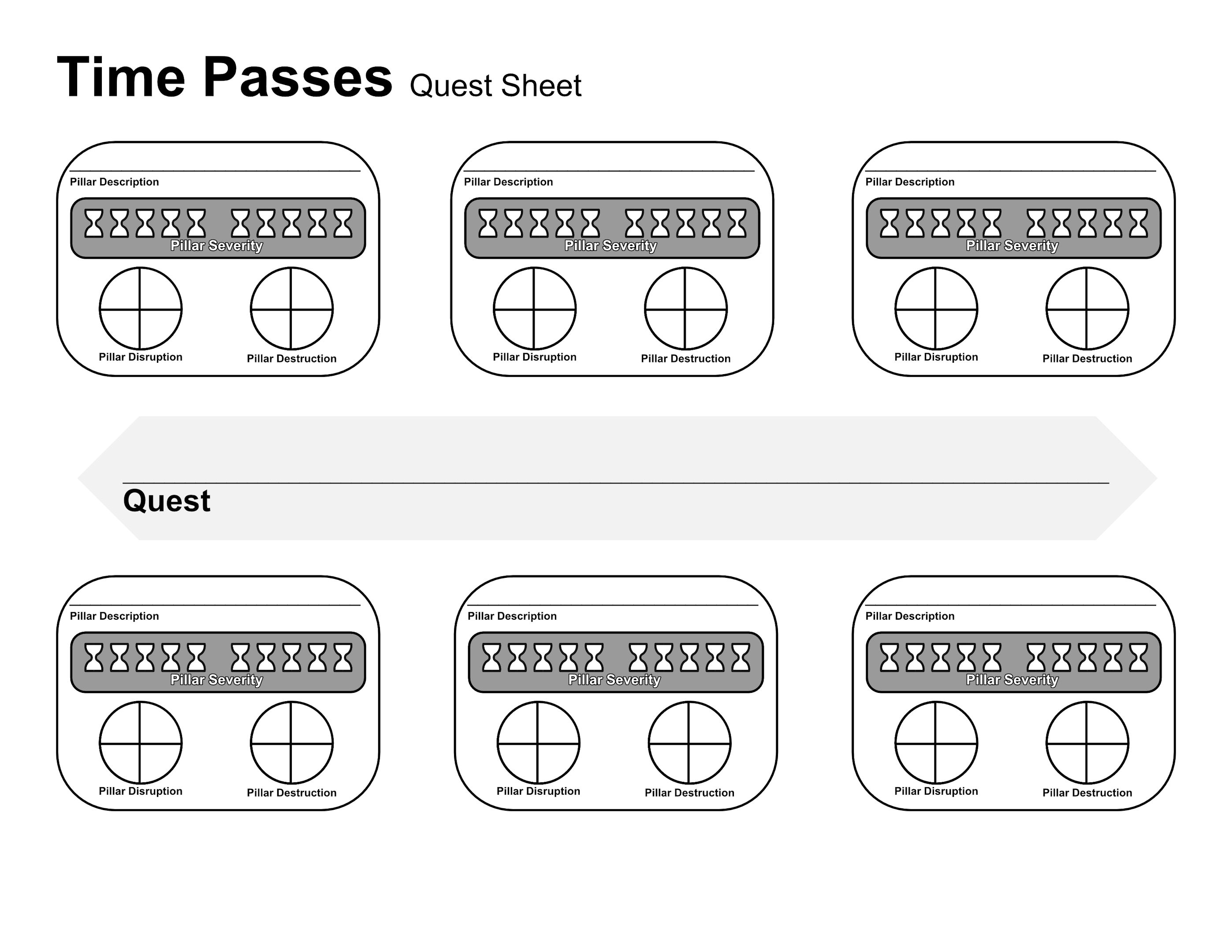 Time Passes is a tabletop role playing game for 3-5 players about fantasy Heroes dealing with a Nightmare so overwhelming that it will take generations to defeat. The story focuses on the perspective of a single Immortal who watches as their friends grow up and age out of their heroic journeys, the losses mounting over time even as their cause advances. This is a game of grief at the absence of comrades and the need to move forward in spite of it.
